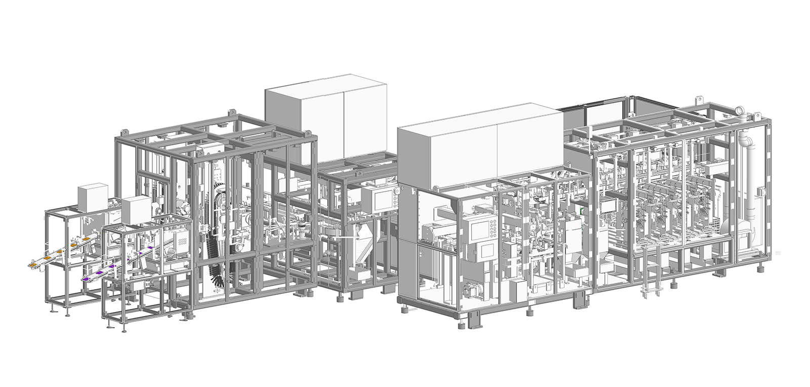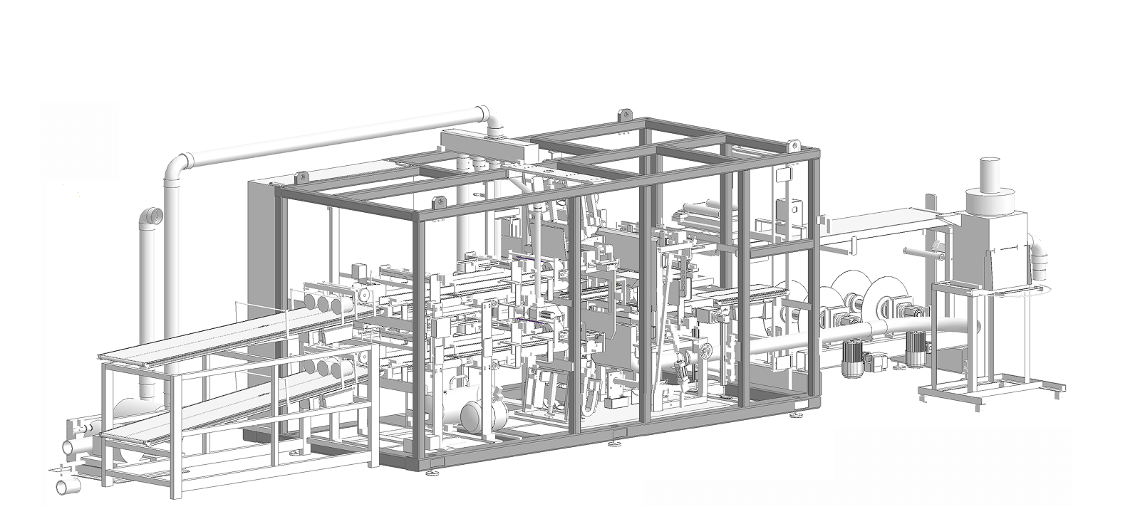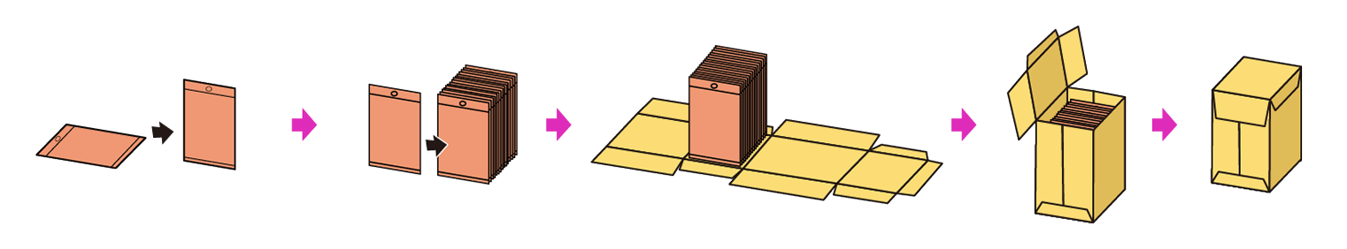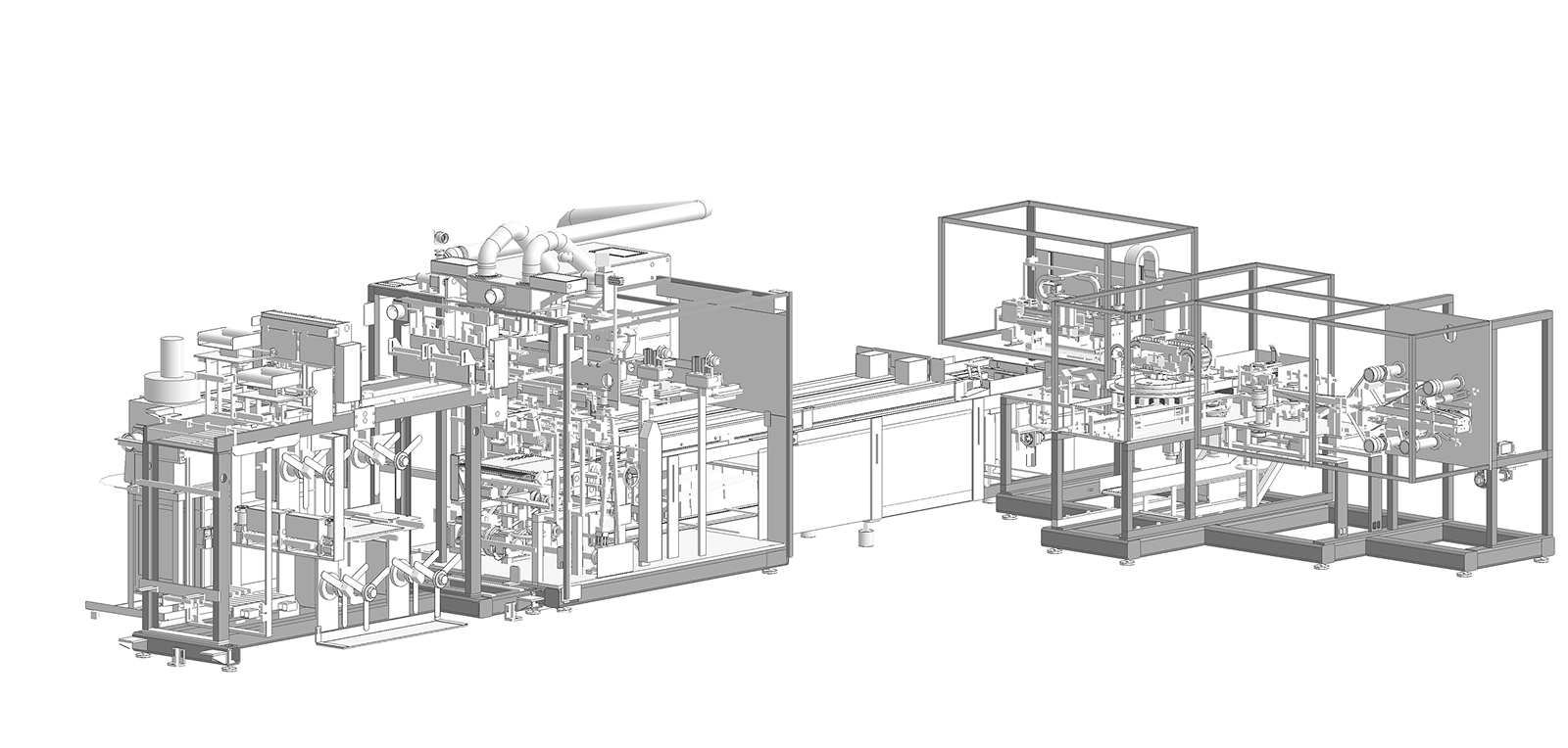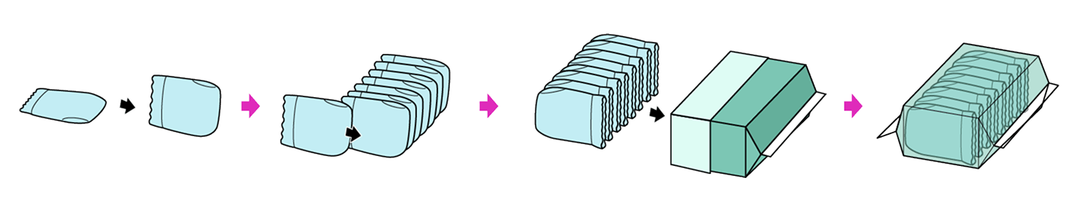 上流側製造ラインより高速に流れてくる、個々に独立した状態のオムツ製品の受け入れに対応します。規定数ごとに正確にカウント集積し、包装します。