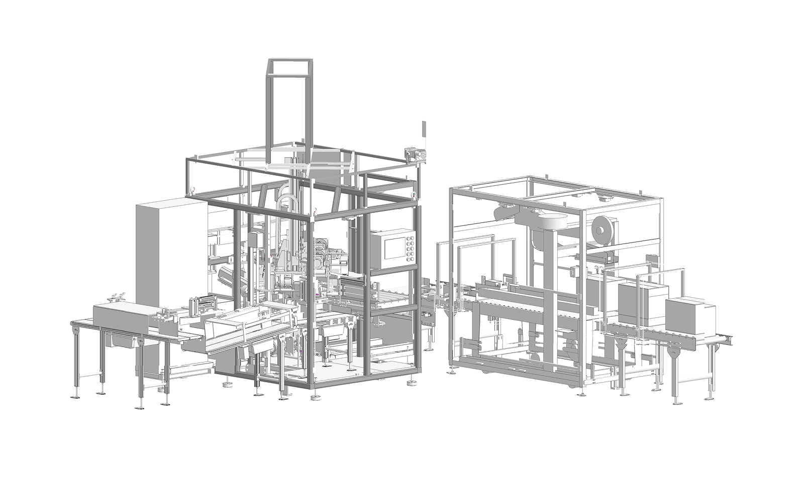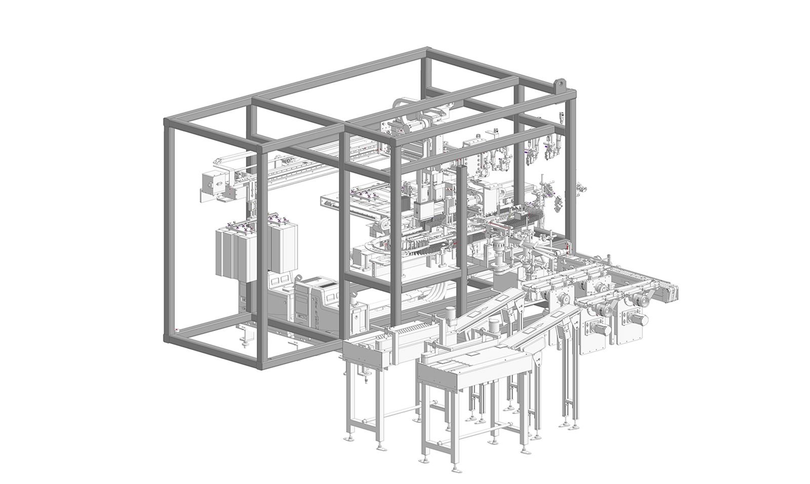 上流から高速かつ大量に供給される小袋菓子を1箱分カウントします。1箱分の製品をつかみ、そのまま垂直に降下しながら箱入れ・紙箱形成を2列同時に行い、そして上面を閉じて封緘し、下流へ排出します。