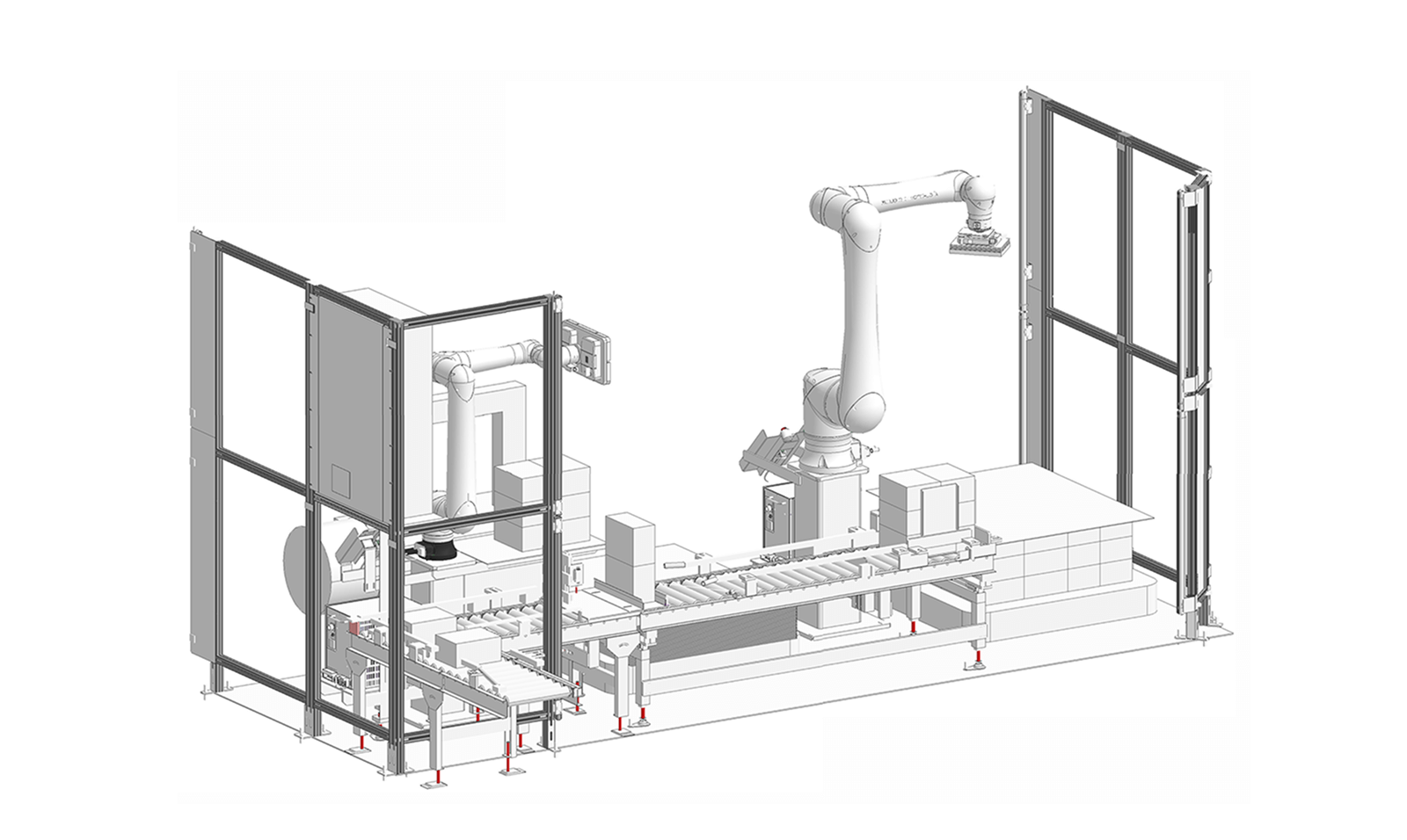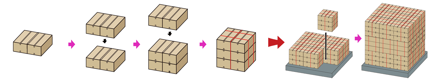 1台目のロボットによって6箱を積み上げて、そのまま3か所自動でバンド掛けを行います。レーンに戻し、2台目のロボットによってパレット上に規則的に積み上げられます。重労働からの解放、省力化によって生産性が向上します。ロボットからメカニック式、箱の積上げ種類のご提案は勿論、ご要望に応じてラッピング工程もございます。
