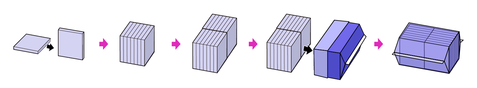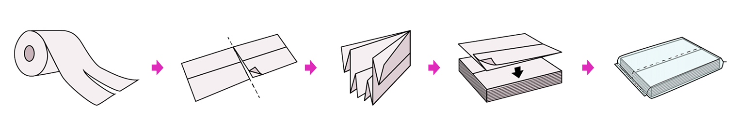 全自動で原紙のロールからポケットティッシュを製造する機械システムです。オリオン機械工業(株)がポケットティッシュの製造機械を開発しました。そのパイオニアとして国内シェアNo.1を誇ります。