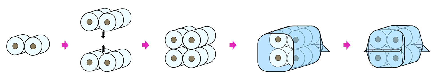 ロール製品を搬送して集積し、タイトに包装します。タイトな包装が実現することによって包材コストが節約できます。また、オプションでIOTを活用した導入ご依頼がご好評いただいております。