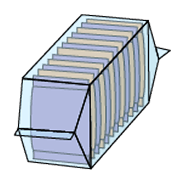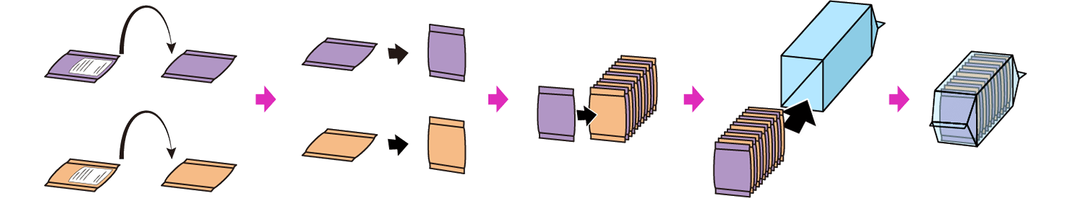 高速かつ製品にやさしいハンドリング技術を応用し、アソート袋の中身を多様に可変できる機械システムです。上流より供給される味の異なる2種類のお菓子の小袋の流れ向き修正をします。次世代リニア搬送システムを駆使して計数・集積します。集積形態を保ち、素早く第2次包装を行います。
