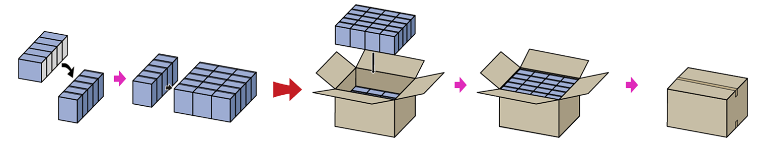 流れてくる5つの箱のお菓子をコンベア上で箱の向きを修正し、4列分まとめて垂直降下して段ボールへ投入します。段ボールひと箱分を投入後、テープで封緘をします。人の手作業のような丁寧さと機械システムならではの便利さで、お取り扱い商品の梱包に貢献いたします。